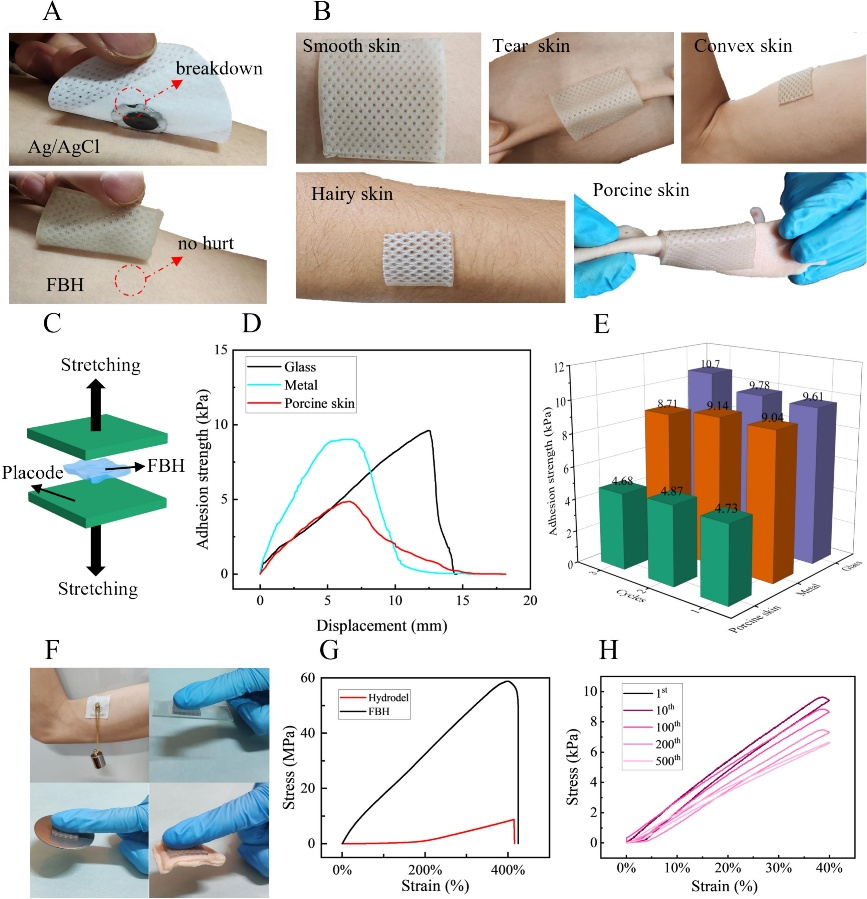 总结:在本工作中,首次使用针刺模具将网眼织物与SA/PVA/PAM/SGP导电水凝胶一体集成,成功制备了用于智能可穿戴设备的织物基水凝胶(FBH)电极。实验结果表明,通过将尼龙网眼织物的弹性和高强度与独特的多孔水凝胶相结合,FBH在机械强度、柔韧性、透气性、粘附性、保水性、生物相容性和低皮肤-电极阻抗方面表现出优异性能。网状弹性织物为FBH提供了高强度和高保形性的特点,使其在多次使用或恶劣环境条件下不易变形和损坏。水凝胶的优异柔韧性、粘附强度和生物相容性为FBH在长期心电监测中的应用提供了巨大的潜力。FBH的优异粘附性使其能够感知皮肤形状并适应皮肤变形。即使在多次粘附和剥离循环后,它仍能紧密贴合皮肤并捕捉高质量的生物电信号。研究涵盖了各种条件下的健康监测比较,以及连续48小时采集和记录高质量心电信号。这些发现表明,FBH电极在可穿戴长期健康监测领域具有相当大的优势,为心血管疾病的早期诊断提供可靠的技术支持,并促进有效的健康管理。