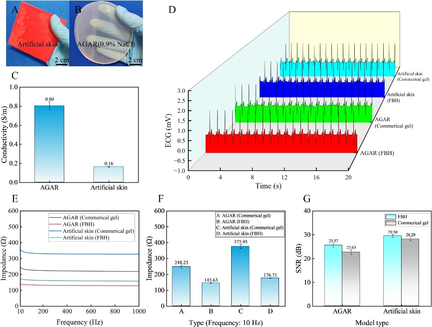 图6.连接到AGAR模型和人造皮肤的FBH电极的性能特征