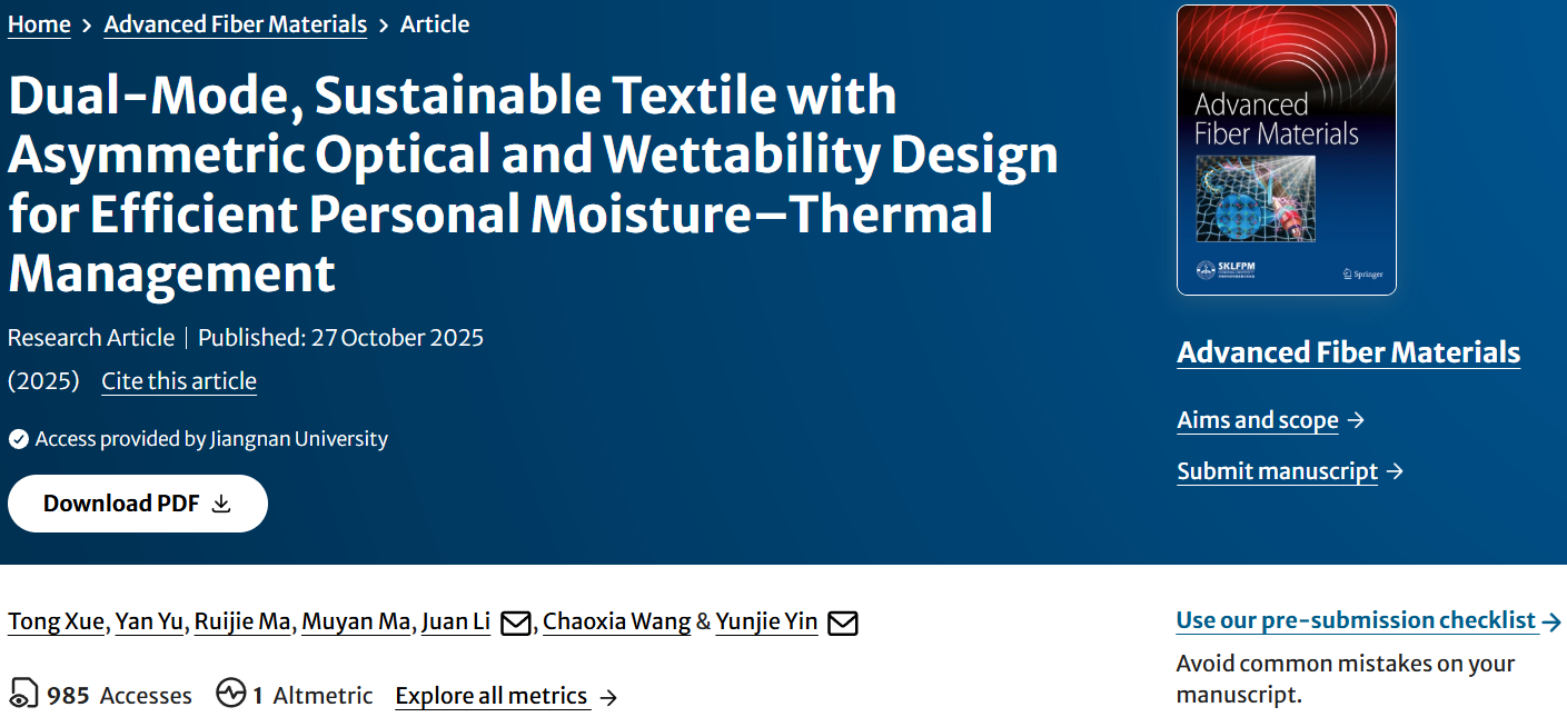 近日,我院智能纺织新材料研究室殷允杰教授在国际顶级期刊Advanced Fiber Materials上在线发表了题为“Dual-Mode, Sustainable Textile with Asymmetric Optical and Wettability Design for Efficient Personal Moisture-Thermal Management”的研究论文。该研究通过分层静电纺丝技术,制备了一种具有不对称光学性能、润湿性和孔径分布的双模式聚乳酸基个人热管理纺织品(DMTex),用于高效的个人湿热管理。独特的光学结构设计和功能颗粒的添加使DMTex具有优异的光学性能。三层结构设计赋予DMTex优异的单向导湿和防反渗性能。同时,DMTex还具有良好的耐磨性、生物相容性和可降解性。这种双模且可持续的DMTex在实现高效的个人湿-热舒适性方面展现出巨大潜力。一本道无码