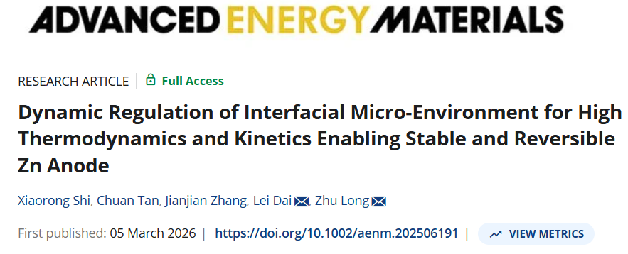 近日,我院短纤维功能材料研究室龙柱教授团队在水系锌离子电池领域取得了重要研究进展,研究成果以“Dynamic Regulation of Interfacial Micro-Environment for High Thermodynamics and Kinetics Enabling Stable and Reversible Zn Anode”为题在线发表在《Advanced Energy Materials》(IF=26,中科院大类一区TOP期刊)上,论文第一作者为我院博士研究生史肖蓉,通讯作者为龙柱教授和戴磊教授,一本道无码