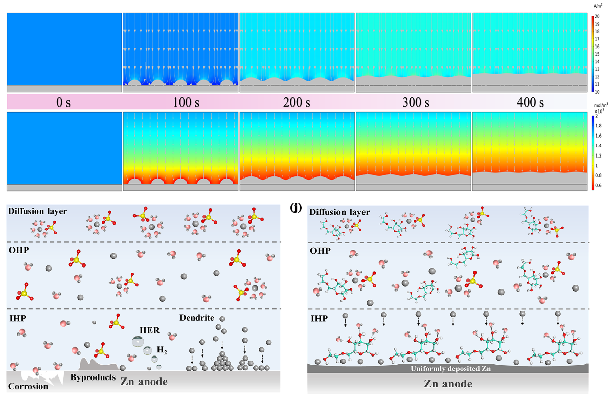 针对上述问题,研究团队提出了一种新型电解液调控策略,通过引入一种纤维素衍生物分子添加剂实现了对锌负极与电极液界面的微观结构与化学环境的动态调控,添加剂分子通过与电解液组分和锌负极表面的相互作用,抑制了电解液中游离水与锌负极的接触,同时促进了锌离子的去溶剂化过程及迁移过程,进而有效抑制了不良反应的发生,提高了锌负极的稳定性与可逆性。该研究为高性能水系锌离子电池的界面设计及电解液优化提供了新思路,对推动水系锌离子电池的发展具有重要意义。