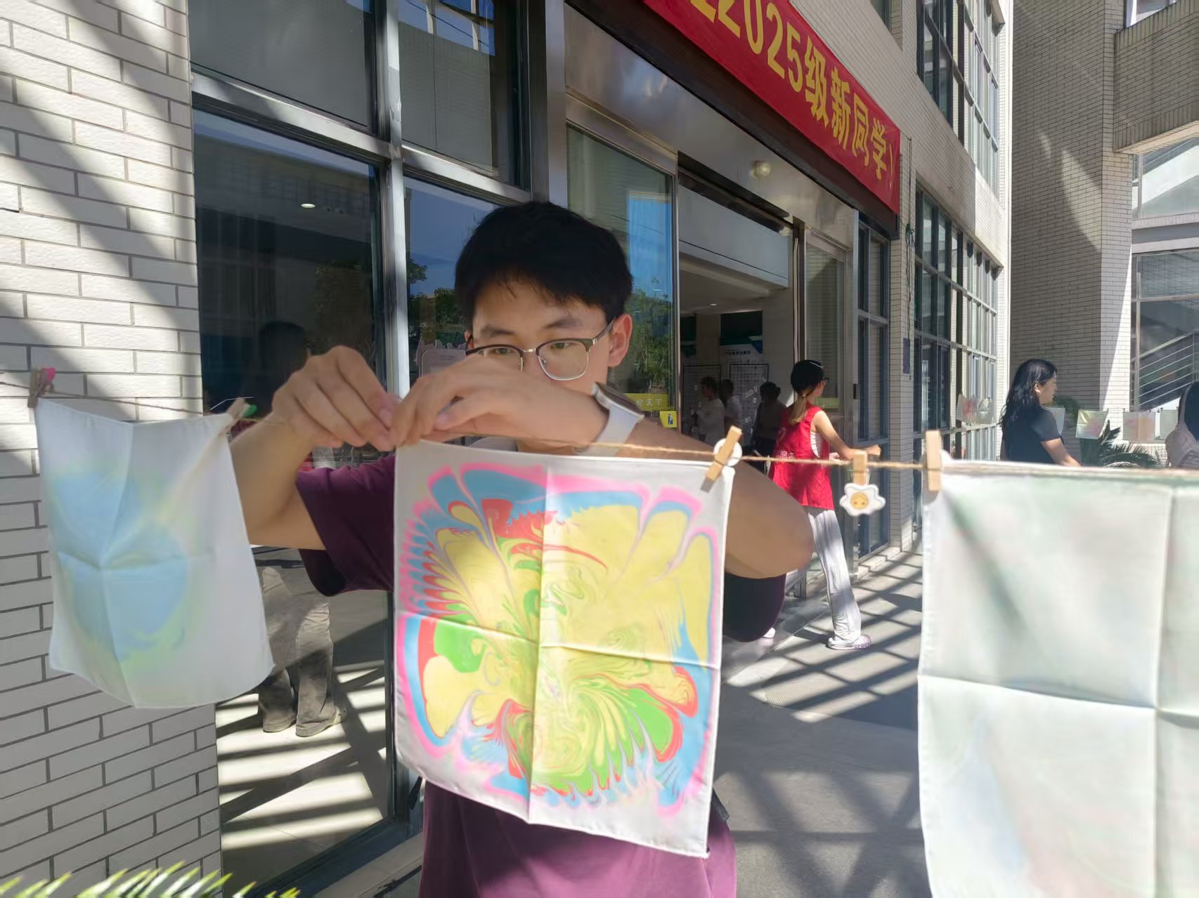 在非遗传承互动区,新生亲手调色、水拓、创作,完成属于自己的水拓丝巾。这不仅是一次美育体验,更是一场心灵与传统文化的对话,心理健康教育与非遗传承使命在此得到了完美融合。